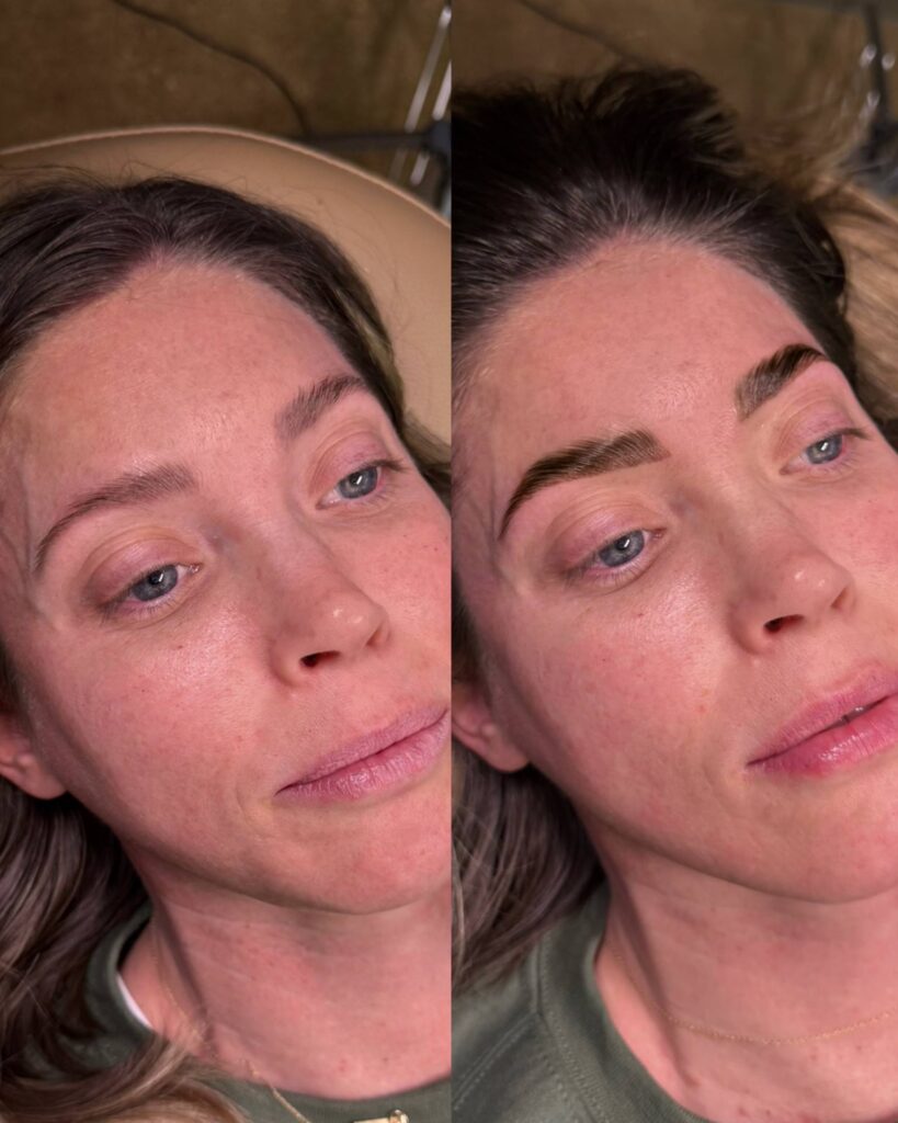 A Pro Tip for Fading PMU: Brow lamination combined with tinting is actually one of my favorite tricks for concealing fading permanent makeup. As microblading naturally fades over time, the color can become patchy or uneven. Lamination lifts and repositions your natural hairs to camouflage those faded areas, while tinting helps blend your natural hair color with the remaining pigment in the skin. The result? Your brows look cohesive and full again while you decide whether you’re ready for a color boost or want to let your PMU continue fading naturally.